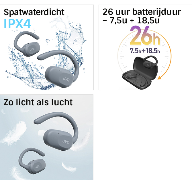 | Batterijduur | luistertijd oordopjes | Tot 8 uur | Tot 9,5 uur | Tot 7,5 uur |