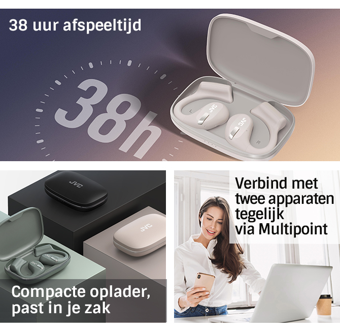 Het open-ear ontwerp vermindert druk en vermoeidheid, perfect voor mensen die traditionele in-ear of over-ear modellen oncomfortabel vinden.